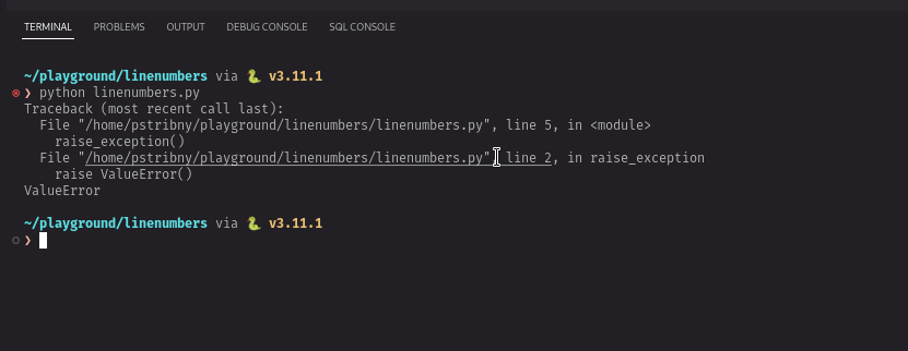 VSCode will recognize the syntax and allows us to jump to linenumbers.py, on line 8, and character number 3.