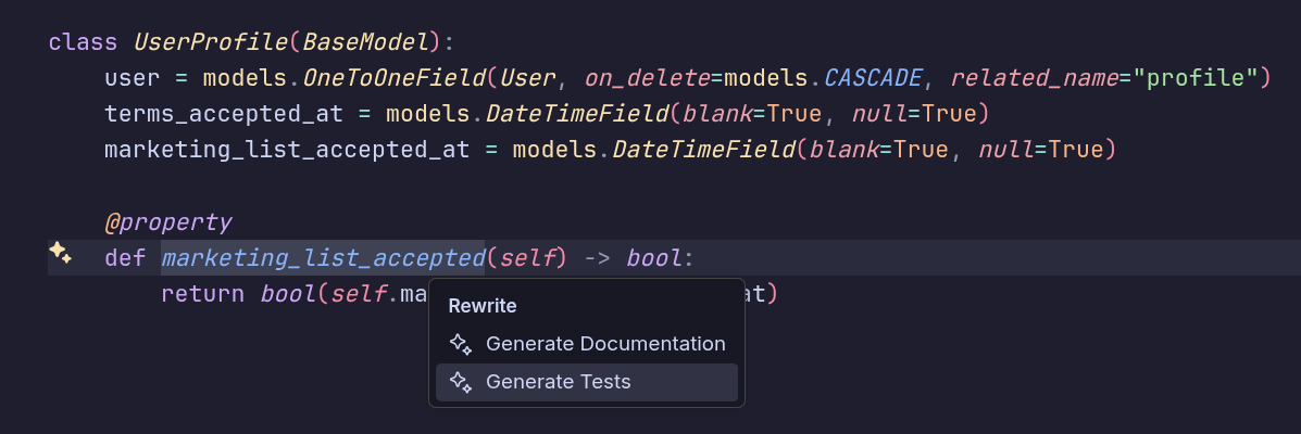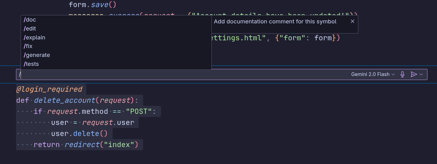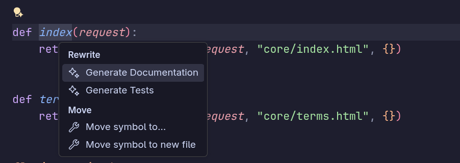 Generate documentation action appears when the cursor is placed at a symbol that is typically documented (think class and function names). You can easily add language-specific descriptions in the form of, e.g., JSDoc for JavaScript or Python’s docstrings. It is handy when you don’t remember all the syntax for documenting function parameters and other specifics.