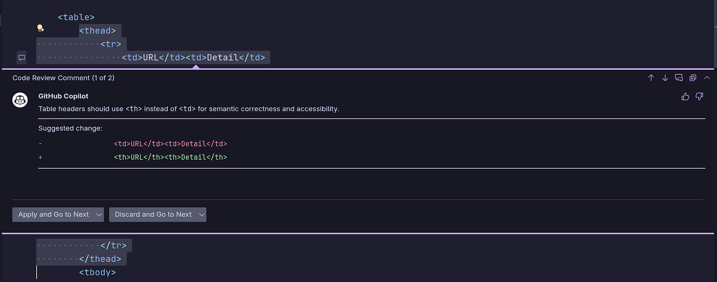 Review smart action instructs the GitHub Copilot to provide a code review when some code has been selected. However, the result is not just textual feedback, but rather a series of proposed enhancements that you can go through. You can accept or reject each of them separately.