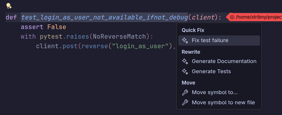 There is also the Fix test failure action that can be invoked from within test code that failed. Again, the editor needs to be aware of the problem, so such action will be available only when using the integrated test runner.