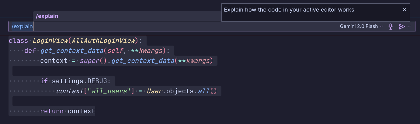 With the Explain action, you can directly get a short summary of what certain code does or explore problems highlighted in the editor. I find it strange that the Explain action is not offered when any code is selected, as it only appears when selected code has a problem identified within or when the cursor is placed directly at some problematic code.